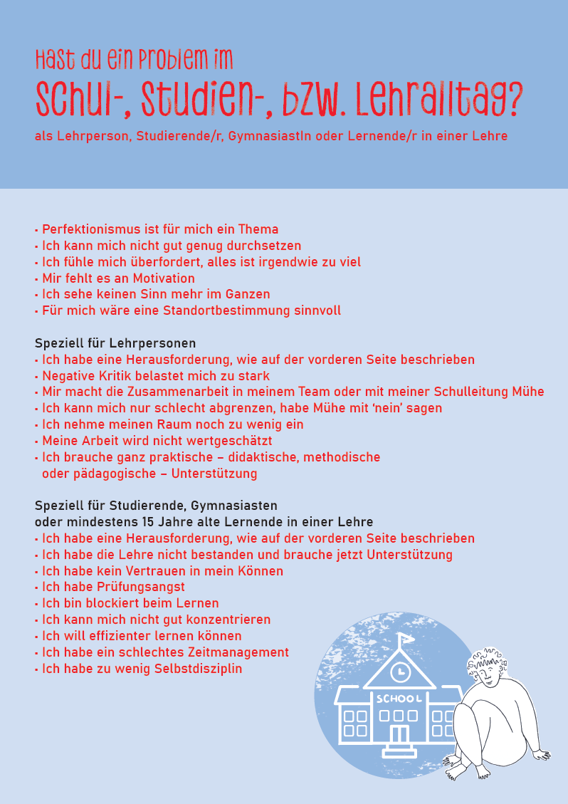- Bist du Lehrperson, DozentIn, StudentIn, GymnasiastIn oder ein/e mindestens 15 Jahre alte/r Lernende/r in einer Lehre und hast ein Problem im Schul-, Lehr-, bzw. Studienalltag? Dann bekommst du hier bei mir die nötige Hilfe.